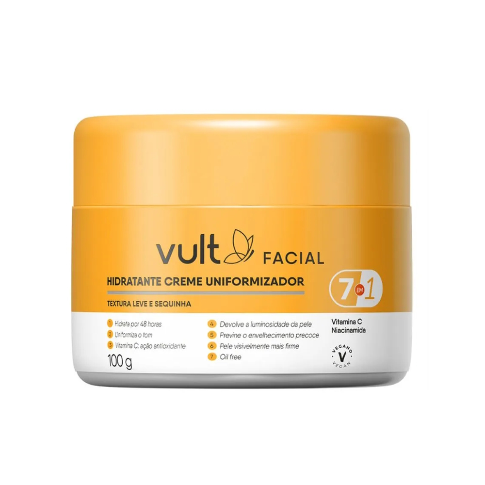 ✨ Ilumine e uniformize sua pele com o Vult Creme Hidratante Uniformizador Facial. Este creme é enriquecido com Vitamina C e Niacinamida, hidrata profundamente enquanto ajuda a clarear manchas e uniformizar o tom da pele, deixando-a radiante e saudável. Também previne o envelhecimento precoce.